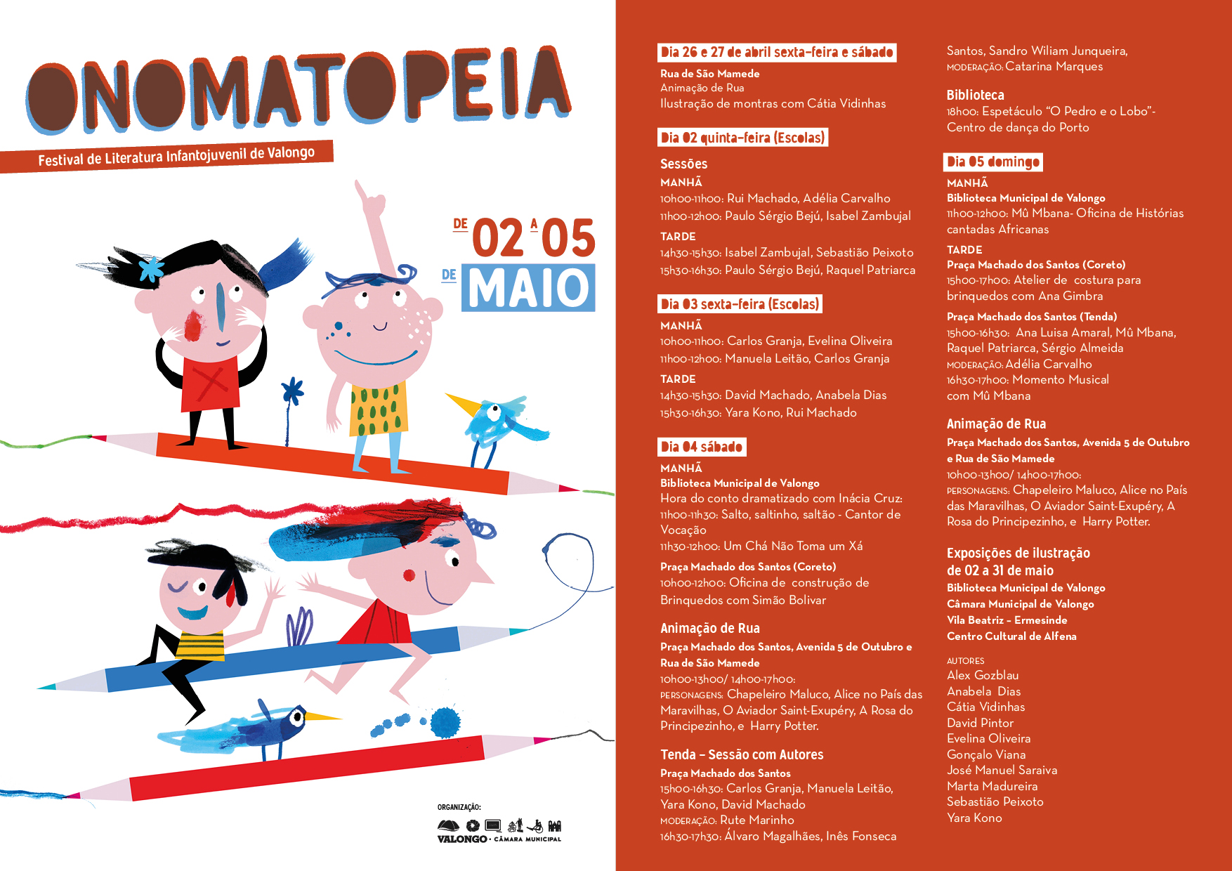 A literatura infantojuvenil é há muito tempo determinante para a criação de hábitos de leitura, como se afirmou como género mais vibrante no panorama editorial português, tendo granjeado prémios e distinções um pouco por todo o mundo. Projetos como o Plano Nacional de Leitura de Bibliotecas Escolares em muito têm contribuído para o desenvolvimento de uma estratégia de promoção da literacia no público mais jovem. Este evento pretende contribuir para este esforço colocando em contacto escritores, ilustradores e os leitores, num ambiente descontraído e capaz de proporcionar um interesse sólido pela leitura e expressão plástica. A Câmara Municipal de Valongo consciente de que este tipo de experiências são determinantes para a consolidação de um gosto de leitura e para o desenvolvimento de uma cultura estética junto dos mais novos, leva a efeito o evento Onomatopeia - Festival de Literatura Infantojuvenil. A Onomatopeia ocorrerá em dois locais dois locais distintos: Praça Machado dos Santos - presença de escritores e ilustradores complementadas com oficinas de ilustração; Biblioteca Municipal de Valongo - Exposições, Escrita Criativa, Espetáculo de Dança com temas baseados nos contos tradicionais e muito mais... Venha viajar connosco pelo imaginário infantil!