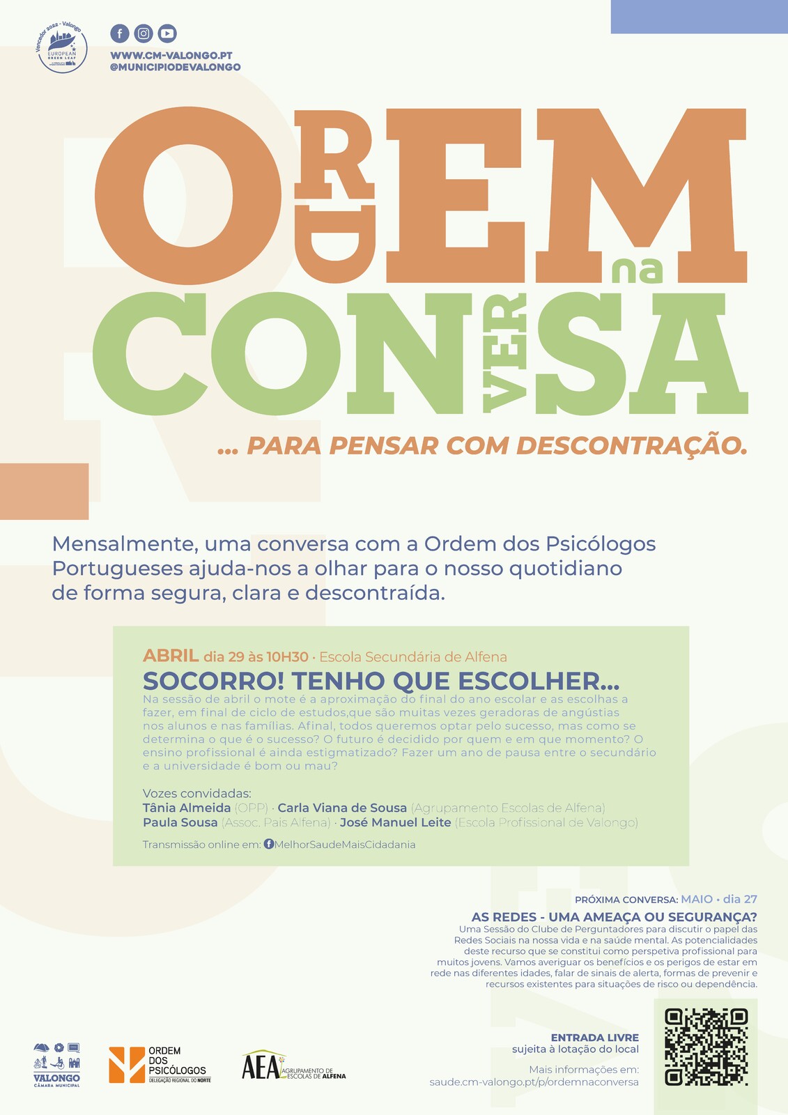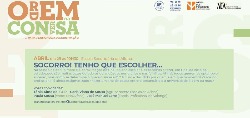 Socorro! Tenho que escolher... é o tema do próxima sessão do projeto “Ordem na Conversa", que terá lugar no dia 29 de abril, pelas 10h30, na Escola Secundária de Alfena.
