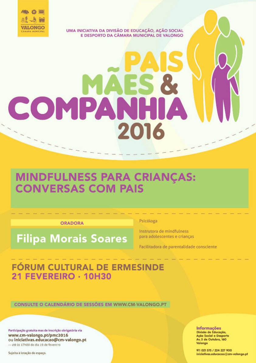 Filipa Morais Soares, psicóloga, instrutora de mindfulness para adolescentes e crianças, facilitadora de parentalidade conscienteé a próxima oradora do Pais, Mães e Companhia 2015. "Mindfulness para Crianças: Conversas com Pais" é o tema da próxima sessão, que se realizará no dia 21 de fevereiro, domingo, pelas 10h30, no Fórum Cultural de Ermesinde.