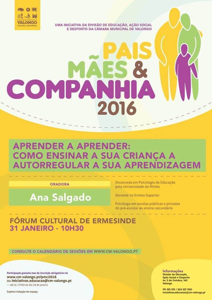 A próxima sessão de Pais, Mães & Companhia realiza-se no dia 31 de janeiro, domingo, pelas 10h30, no Fórum Cultural de Ermesinde e contará com a presença da Professora Doutora Ana Salgado, que abordará o tema «Aprender a Aprender: Como ensinar as crianças a autorregular a sua aprendizagem».