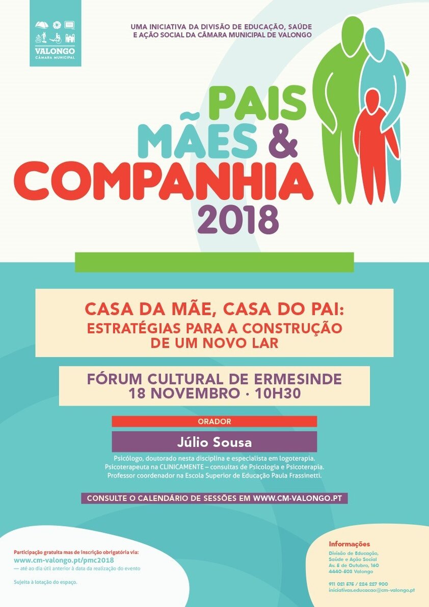 No próximo dia 18 de novembro abordar-se-á o tema "Casa da mãe, casa do pai: estratégias para a construção de um novo lar". Esta sessão, que decorrerá no Fórum Cultural de Ermesinde pelas 10h30, abordará o importante tema da coparentalidade positiva após o divórcio, nomeadamente a reorganização que esta alteração exige. A importância de um relacionamento funcional com o/a outro/a progenitor, a construção de dois lares, elementos básicos de acordo para uma parentalidade partilhada, a construção de um nova família serão alguns aspetos a abordar.