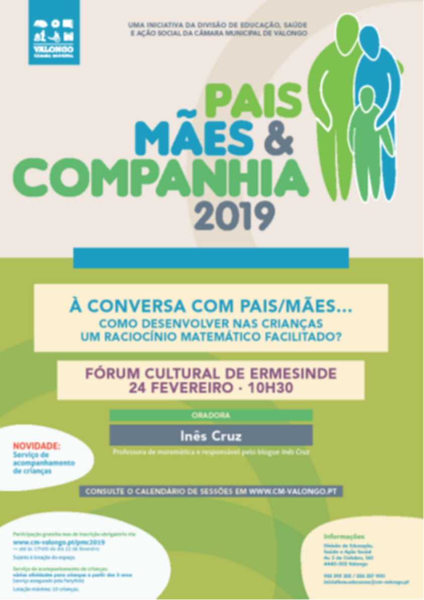 No âmbito do projeto Pais, Mães & Companhia, no dia 24 de fevereiro vamos falar de matemática, com o tema “À conversa com pais/mães… Como desenvolver nas crianças um raciocínio matemático facilitado?”. A oradora convidada é Inês Cruz, que para além de ser professora de matemática há quase duas décadas, tem uma vasta experiência como oradora em diversos eventos dirigidos essencialmente a pais/mães e é ainda responsável pelo blogue Inês Cruz . A sessão decorrerá, como habitualmente, pelas 10h30, no Fórum Cultural de Ermesinde.