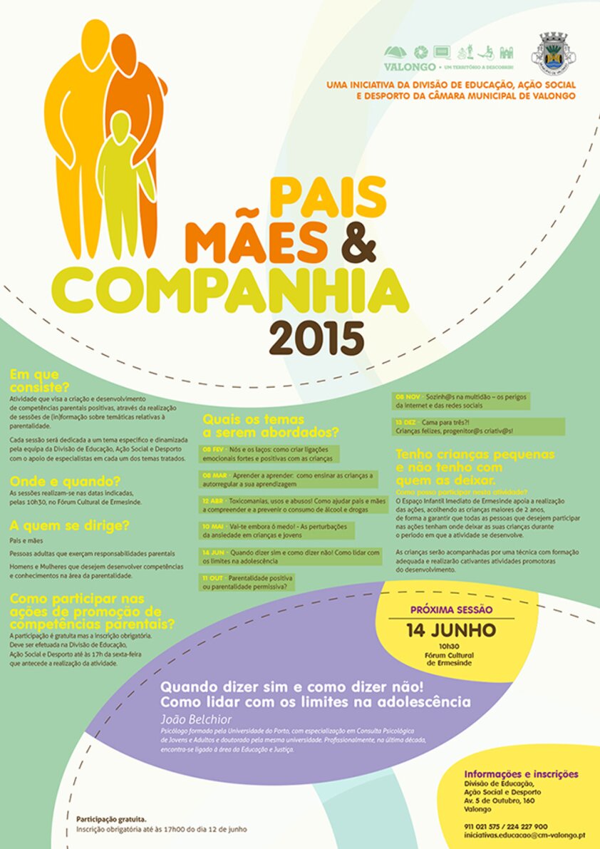 No próximo dia 14 de junho, pelas 10h30, o Fórum Cultural de Ermesinde acolhe mais uma sessão de "Pais, Mães e Companhia" que terá como tema "Quando dizer sim e como dizer não - Como lidar com os limites na adolescência". O orador convidado será João Belchior, psicólogo especialista em consulta psicológica de jovens e adultos.