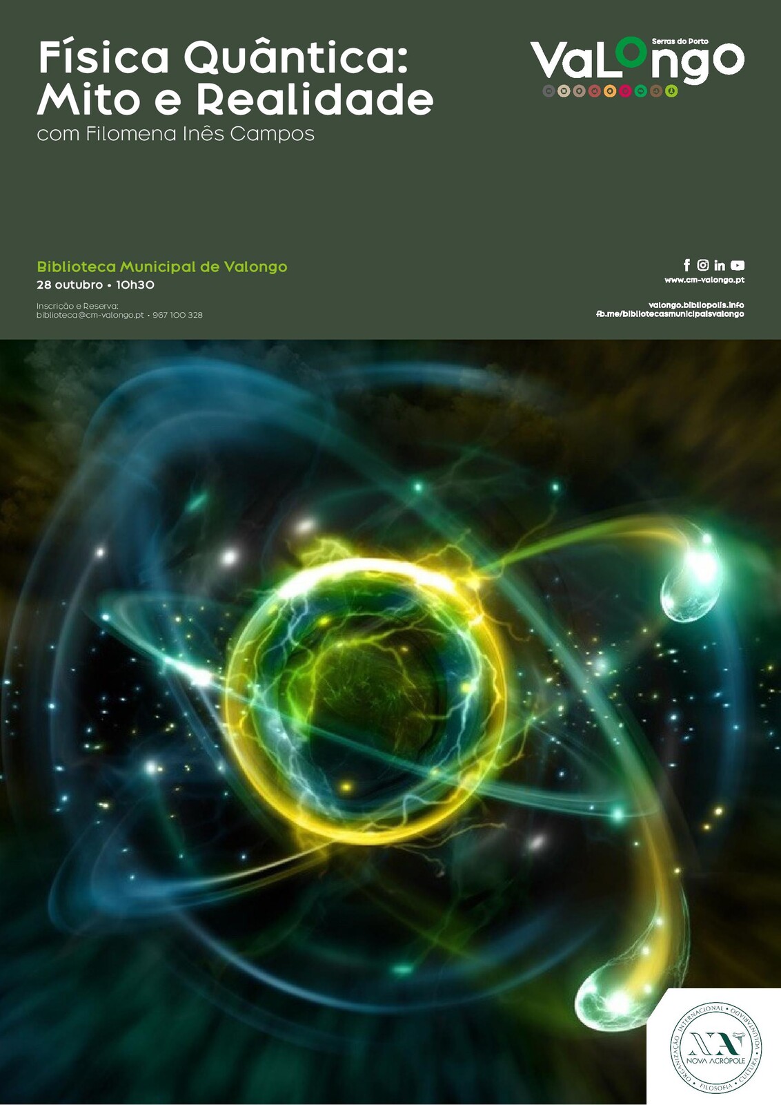 A Biblioteca Municipal de Valongo acolhe no próximo dia 28 de outubro, pelas 10h30, mais uma palestra promovida pela Nova Acrópole, Escola de Filosofia. O tema deste mês será "Física Quântica: Mito e realidade" e terá como oradora Filomena Inês Campos.