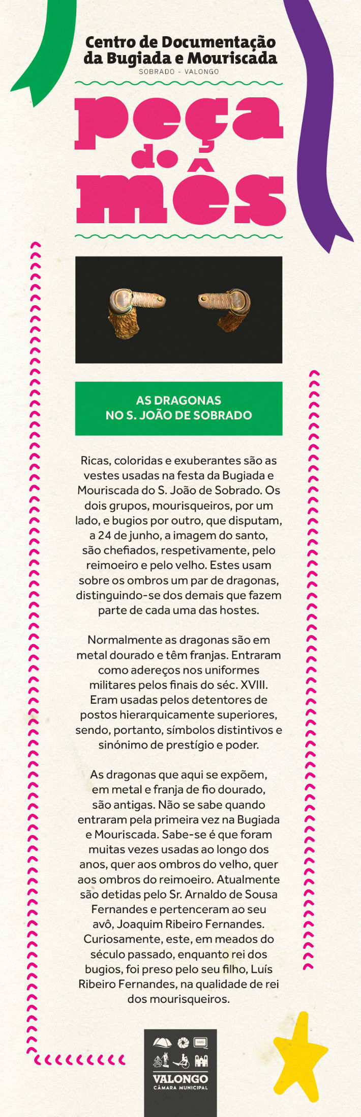 O projeto denominado de "Peça do Mês no CDBM" expõe durante o mês de S. João um par de dragonas. Estes objetos são usados, a 24 de junho, pelos principais protagonistas da Bugiada e Mouriscada.