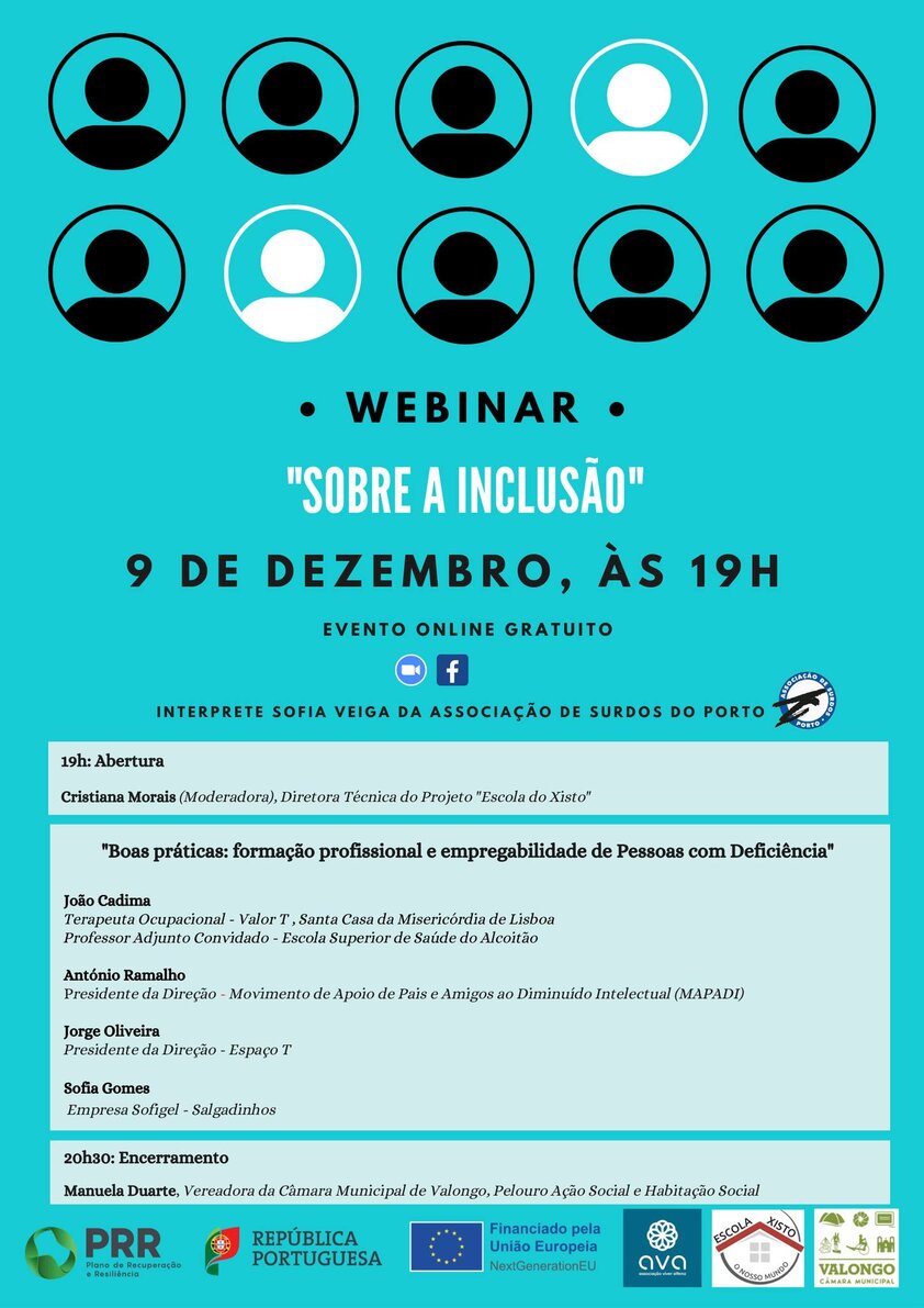 Para assinalar o Dia Internacional das Pessoas com Deficiência, o Projeto "Escola do Xisto" promovido pelo Município de Valongo e pela AVA - Associação Viver Alfena dinamiza o webinar "Sobre a Inclusão", com a temática "Boas práticas: formação profissional e empregabilidade de Pessoas com Deficiência".