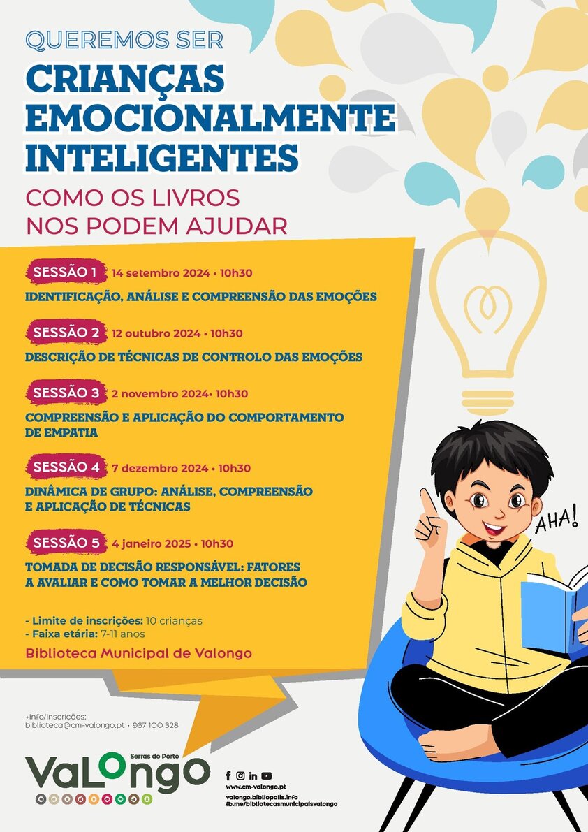 “Queremos ser crianças emocionalmente inteligentes: como os livros nos podem ajudar”, é a mais recente proposta das Bibliotecas Municipais de Valongo que tem como objetivo promover o livro e a leitura e disponibilizar estratégias que permitam aos participantes gerir as emoções. Dirigida a crianças com idades entre os 7 e os 11 anos, esta iniciativa é organizada em cinco sessões, entre setembro deste ano e janeiro de 2025, com a duração de 1h30/cada que decorrerão na Biblioteca de Valongo.