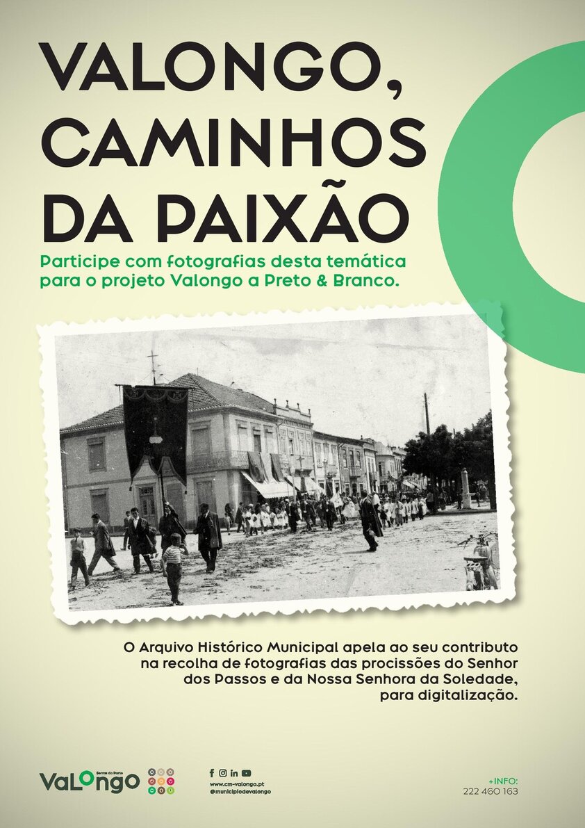No âmbito do projeto "Valongo a Preto e Branco", o Arquivo Histórico Municipal de Valongo está a solicitar o contributo dos munícipes na cedência para digitalização de fotografias da Procissão do Senhor dos Passos e da Procissão da Nossa Senhora da Soledade. As fotografias serão digitalizadas e devolvidas aos/às proprietários/as.