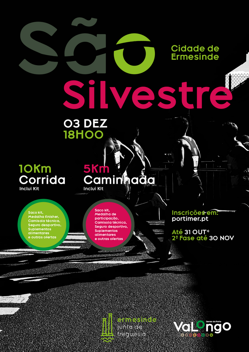 A São Silvestre Cidade de Ermesinde realiza-se no dia 3 de dezembro, pelas 18h00, com uma Corrida de 10 km e uma Caminhada de 5 km, numa coorganização da Junta da Freguesia de Ermesinde e o Município de Valongo.
