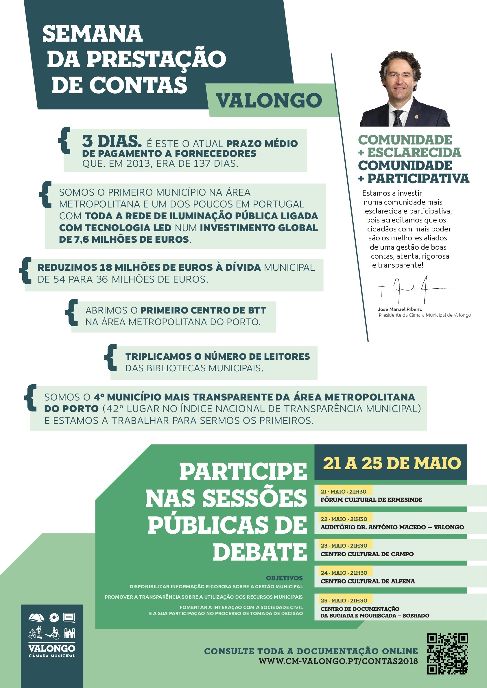 Com o lema «Comunidade mais esclarecida, Comunidade mais Participativa», a Semana de Prestação de Contas do Município de Valongo realiza-se de 21 a 25 de maio, nas cinco freguesias do concelho, sempre às 21h30.