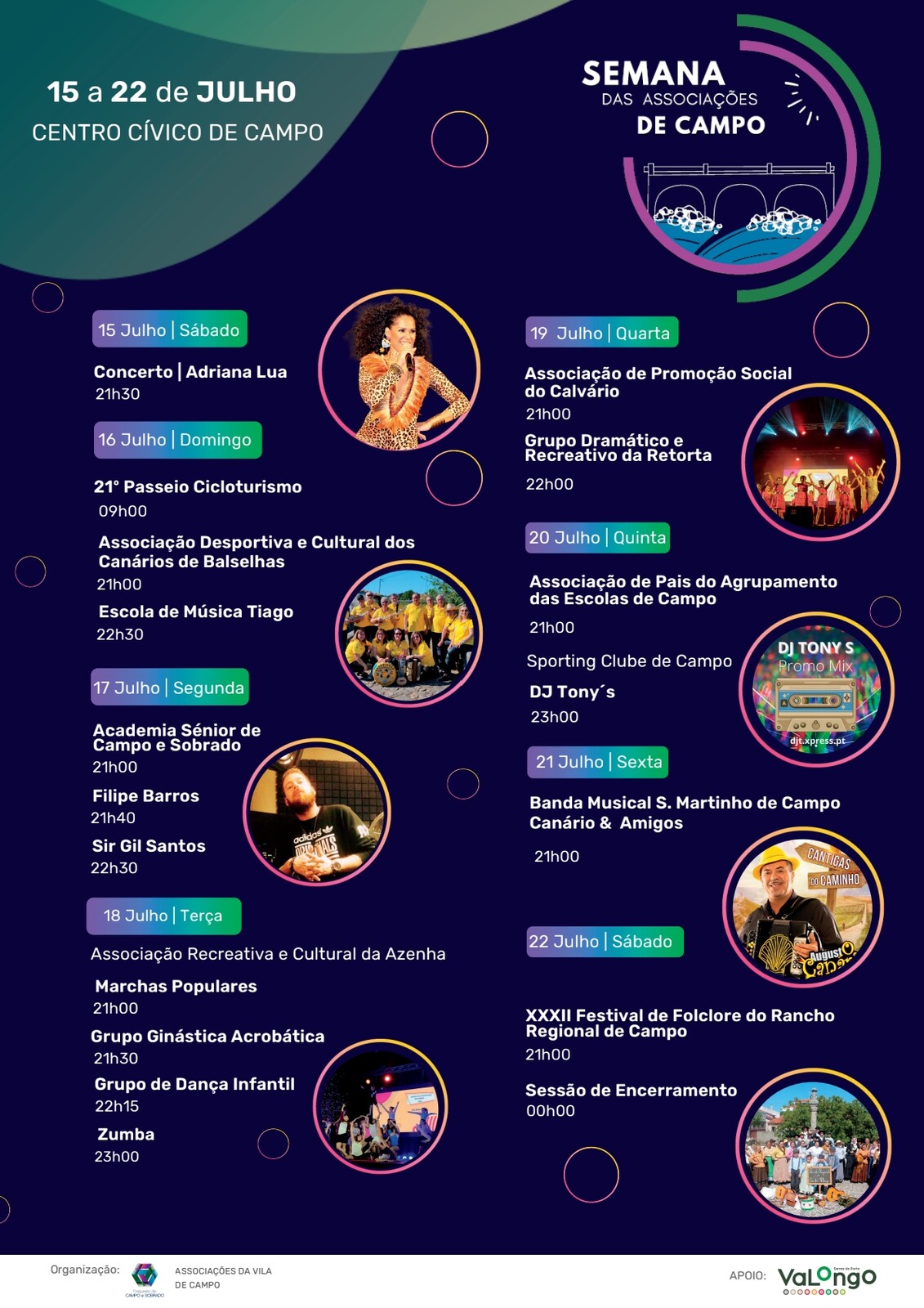 Entre 15 e 22 de julho, o Centro Cívico de Campo vai ser palco de mais uma edição da Semana das Associações de Campo, uma organização da Junta de Freguesia de Campo e Sobrado, das coletividades locais e da Câmara Municipal de Valongo. Durante uma semana, diversas associações da vila de Campo vão dar mostras da sua força e vitalidade num evento que já é um verdadeiro ponto de encontro de milhares de pessoas. Para além da atuação de grupos locais, a iniciativa deste ano conta com a presença de Augusto Canário e de Adriana Lua.
