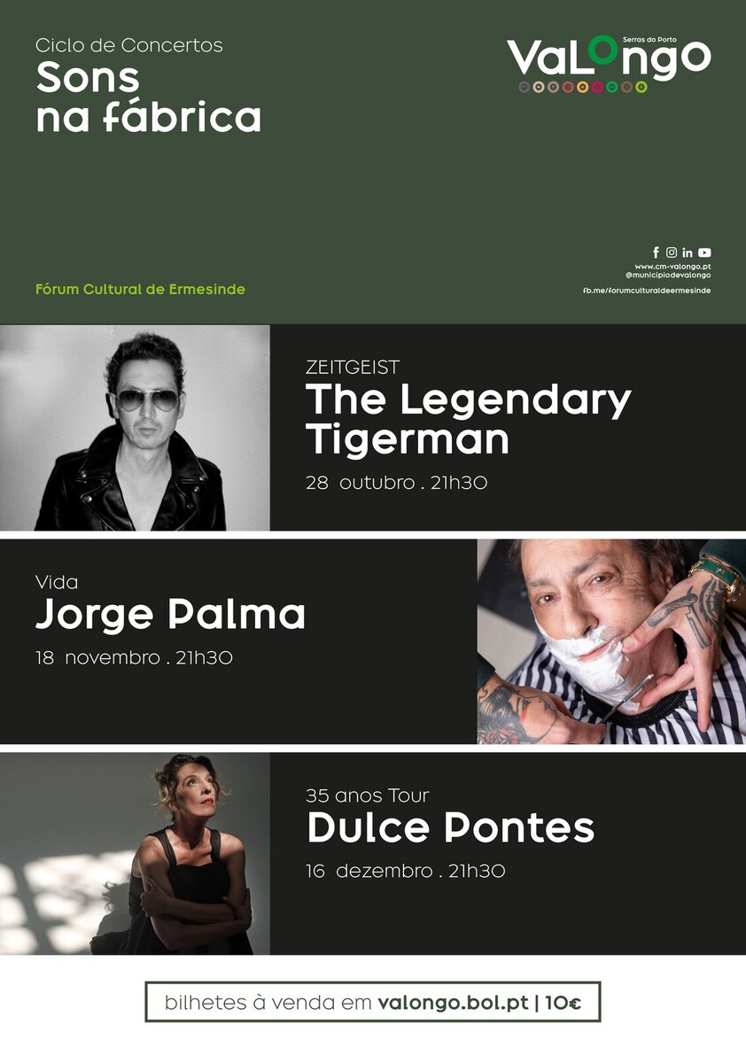 O Fórum Cultural de Ermesinde acolhe mais um Ciclo de Concertos Sons na Fábrica com The Legendary Tigerman, Jorge Palma e Dulce Pontes.