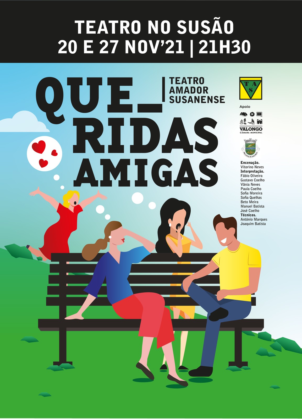 Nos dias 20 e 27 de novembro, pelas 21h30, o TAS - Teatro Amador Susanense irá realizar na sua sala de espetáculos, sita no Lugar do Susão, dois espetáculos com a exibição da peça "QUERIDAS AMIGAS".