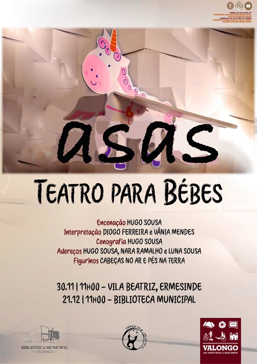 A Biblioteca Municipal de Valongo volta a apostar no Teatro para Bebés e desta vez apresenta o espetáculo "Asas", dinamizado pelos Cabeças no Ar e Pés na Terra, um espetáculo com encenação de Hugo Sousa e interpretação de Diogo Ferreira e Vânia Mendes.
