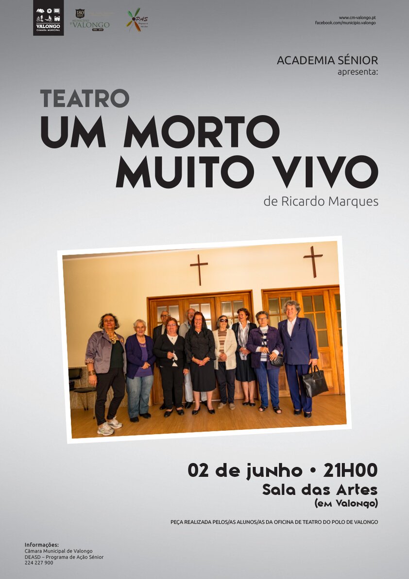 Os alunos e alunas do polo de Valongo da Oficina de Teatro do PAS - Programa de Ação Sénior apresentam a peça «Um Morto Muito Vivo» de Ricardo Marques. A exibição terá lugar na Sala das Artes (C.C.C. Vallis Longus), no dia 2 de junho, às 21h00.