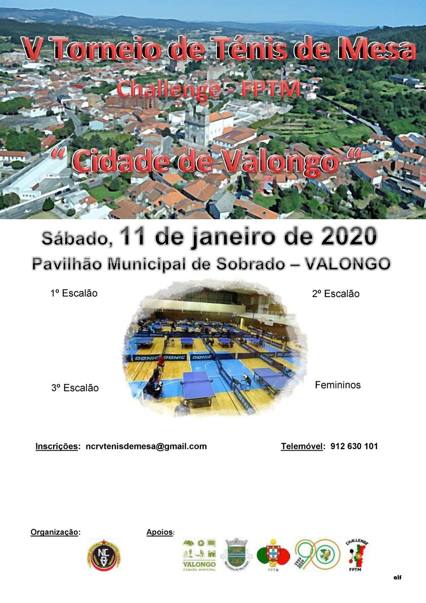 O Núcleo Cultural e Recreativo de Valongo vai realizar, com o apoio da Câmara Municipal de Valongo, dois Torneios de Ténis de Mesa, no fim de semana de 11 e 12 de janeiro de 2020, a partir das 9h00, no Pavilhão Municipal de Sobrado.