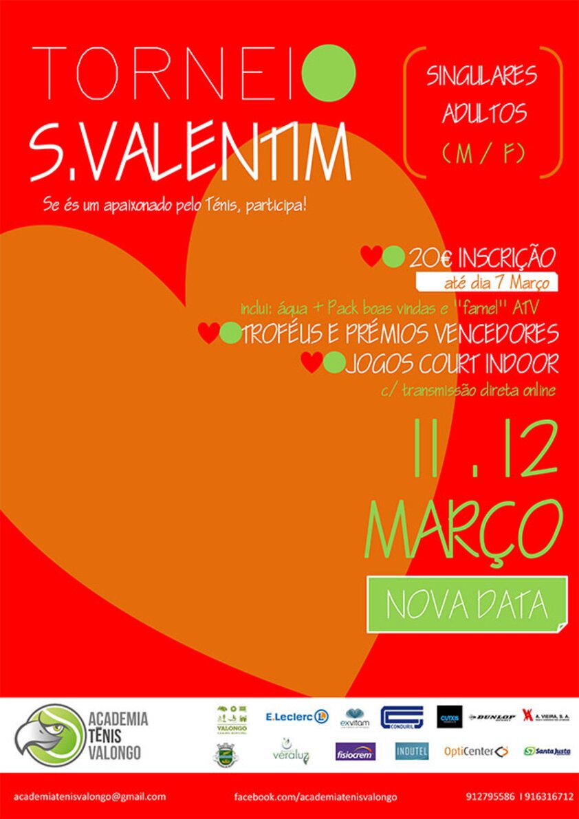 A Academia de Ténis de Valongo, com o apoio da Câmara Municipal de Valongo, vai organizar o torneio de Ténis intitulado "Torneio S. Valentim". Este evento decorrerá nos dias 11 e 12 de março, disputado em court indoor e dirigido exclusivamente à variante singulares adultos, masculinos e femininos. O evento terá transmissão em direto online e será uma iniciativa para os apaixonados pelo ténis.