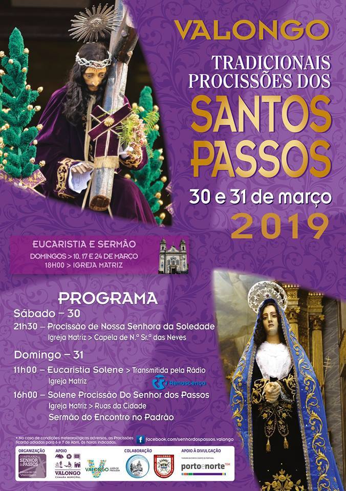 As Seculares Procissões dos Santos Passos realizam-se nos dias 30 e 31 de março. Organizadas pela Confraria do Senhor dos Passos desde 1710, as tradicionais Procissões percorrem as principais as ruas da Cidade de Valongo, que se enchem de devotos para assistirem à recriação dos últimos Passos de Jesus.