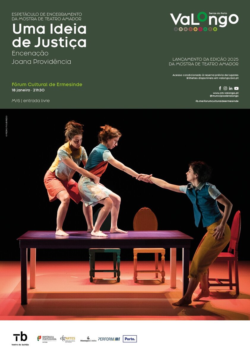 Dia 18 de janeiro, sábado, pelas 21h30, o Fórum Cultural de Ermesinde recebe o espetáculo que marca o encerramento da Mostra de Teatro Amador do Concelho de Valongo 2024. "Uma ideia de Justiça" é uma peça do Teatro do Bolhão que tem encenação de Joana Providência. A entrada é livre, mas o acesso é condicionado à reserva prévia de lugares em www.valongo.bol.pt.