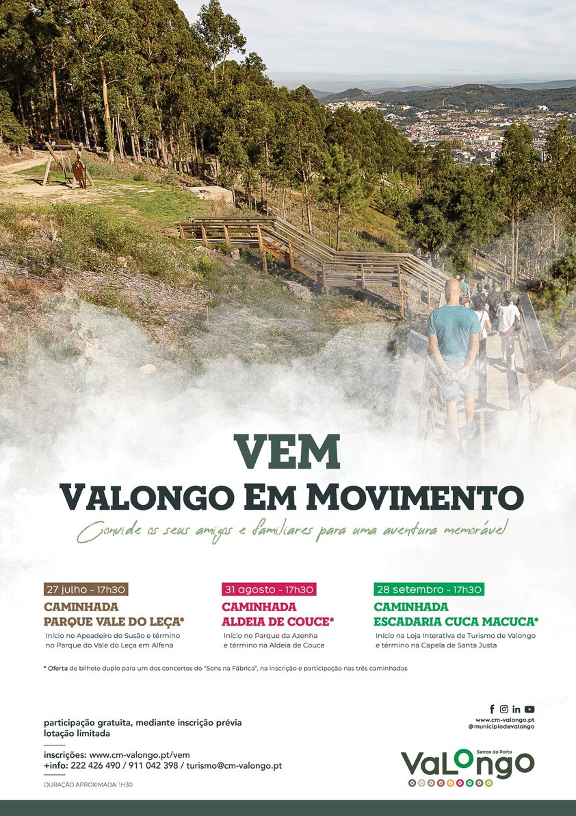 Este é o convite do VEM - Valongo em Movimento, um projeto que consiste na realização de percursos pedestres, acompanhados por guia interpretativo, no último sábado dos meses de julho, agosto e setembro, com a duração média de uma hora e meia e para um número máximo de 30 participantes, mediante inscrição prévia aqui.