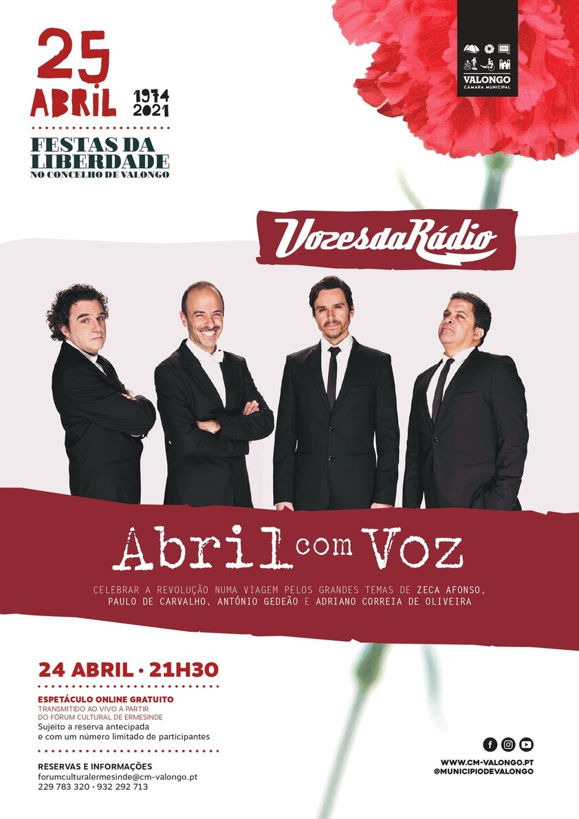 No âmbito das "Festas da Liberdade Valongo 2021", o grupo Vozes da Rádio apresenta "Abril com Voz", um espetáculo especial que leva o público a uma viagem pelos grandes temas de Zeca Afonso, Paulo de Carvalho, António Gedeão, Adriano Correia de Oliveira, entre outros.