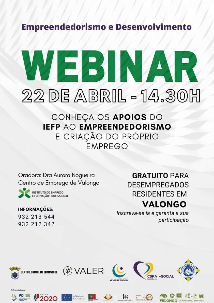 No próximo dia 22 de abril, pelas 14h30, participe no Webinar "Conheça os apoios do IEFP ao empreendedorismo e à criação do próprio emprego!" que terá como oradora Aurora Nogueira, do Centro de Emprego de Valongo.