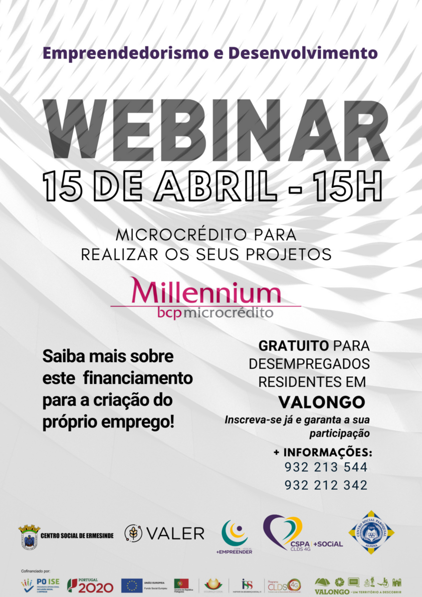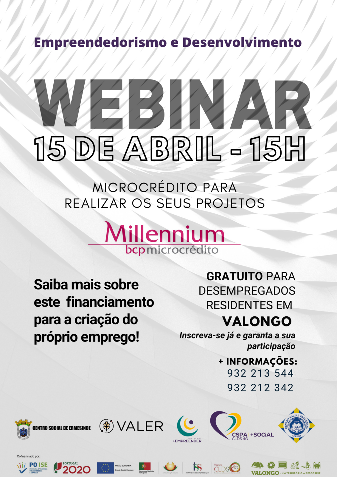 Os CLDS Valer e +SOCiAL vão dinamizar um ciclo de webinars com enfoque na temática do Empreendedorismo. O primeiro realiza-se no dia 15 de abril, pelas 15h00, será dinamizado pelo Millennium BCP e terá como tema o "Microcrédito para criação do próprio emprego".