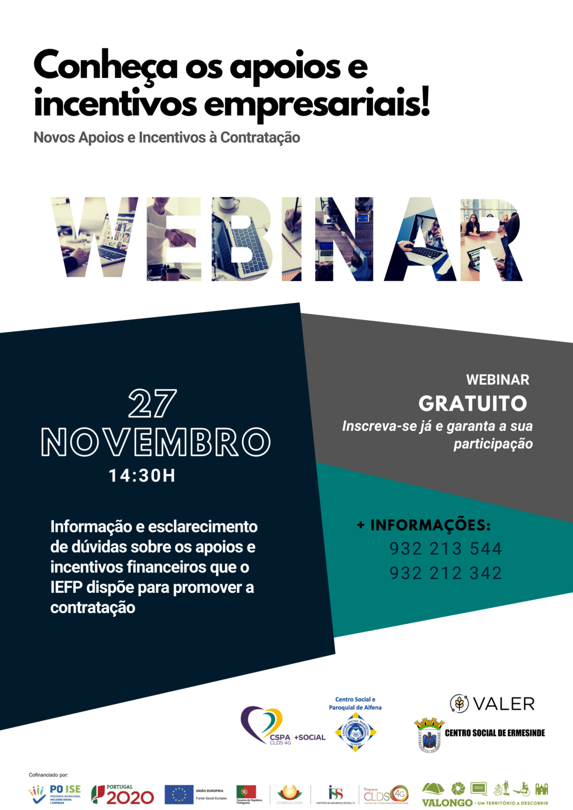 No âmbito do programa Contrato Local de Desenvolvimento Social 4G, o projeto VALER (coordenado pelo Centro Social de Ermesinde) e o projeto +Social (coordenado pelo Centro Social e Paroquial de Alfena), com o apoio do Município de Valongo, realizam no próximo dia 27 de novembro, pelas 14h30, um Webinar sobre Novos Apoios e Incentivos à Contratação. Trata-se de uma sessão cujo objetivo é informar e prestar esclarecimentos sobre os apoios e incentivos financeiros que o IEFP dispõe para promover a contratação.