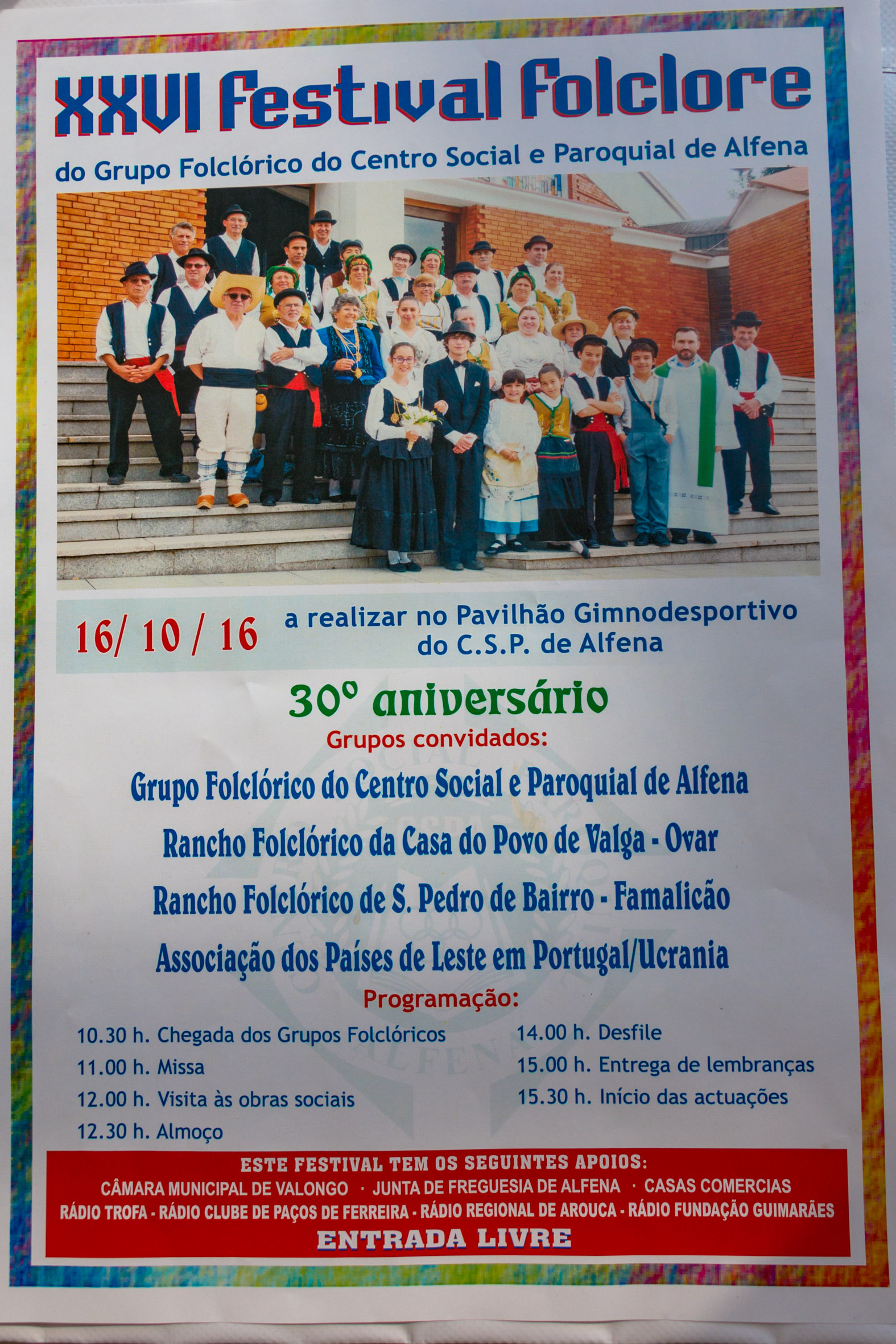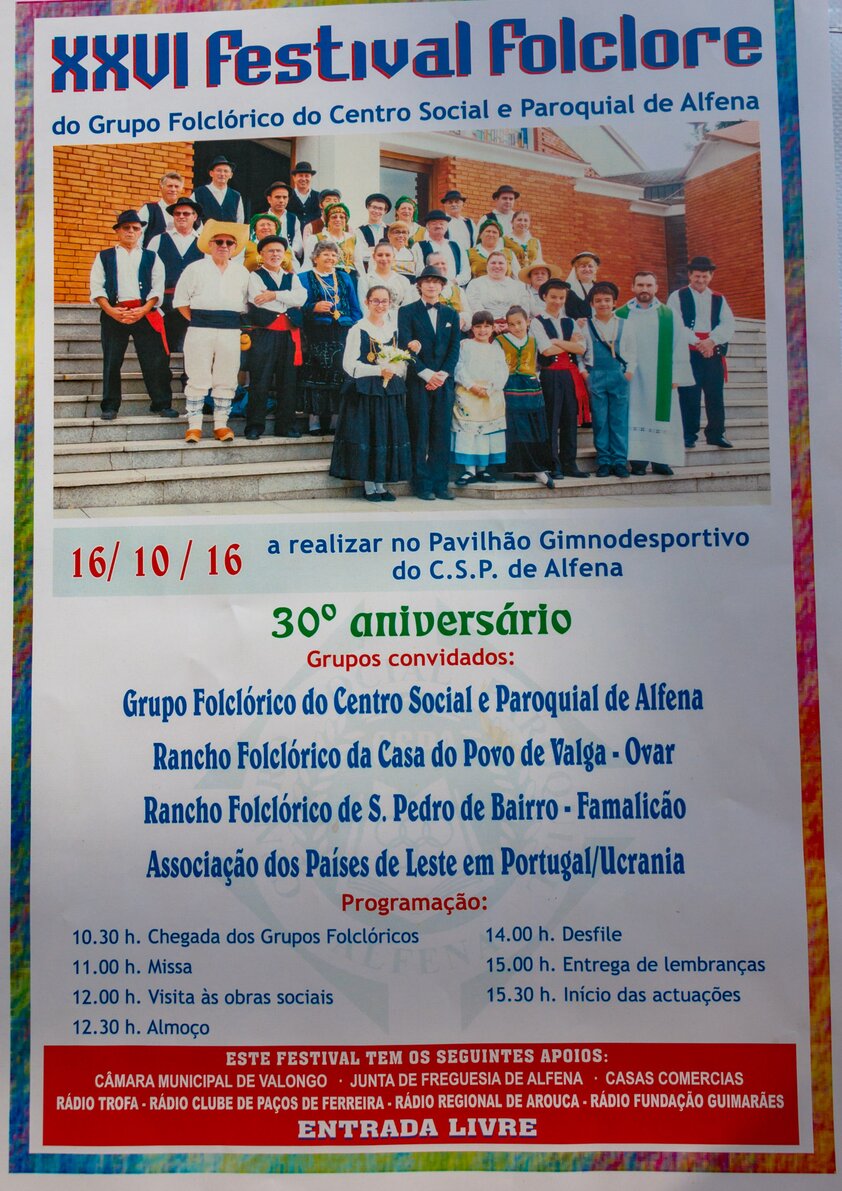 O Grupo Folclórico do Centro Social e Paroquial de Alfena (GFCSPA) promove o seu XXVI Festival de Folclore e comemora o 30.º aniversário no dia 16 de outubro, no Pavilhão Gimnodesportivo do Centro Social e Paroquial de Aflena. O programa começa às 10h30, com a chegada dos grupos folclóricos.