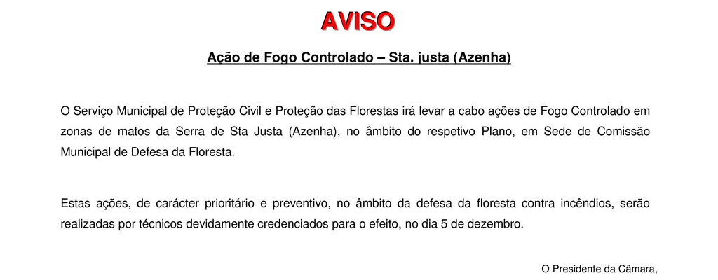 Na próxima terça-feira (dia 5 de dezembro) serão levadas a cabo ações de fogo-controlado na zona da Azenha (às Águas Férreas), na Serra de Santa Justa.