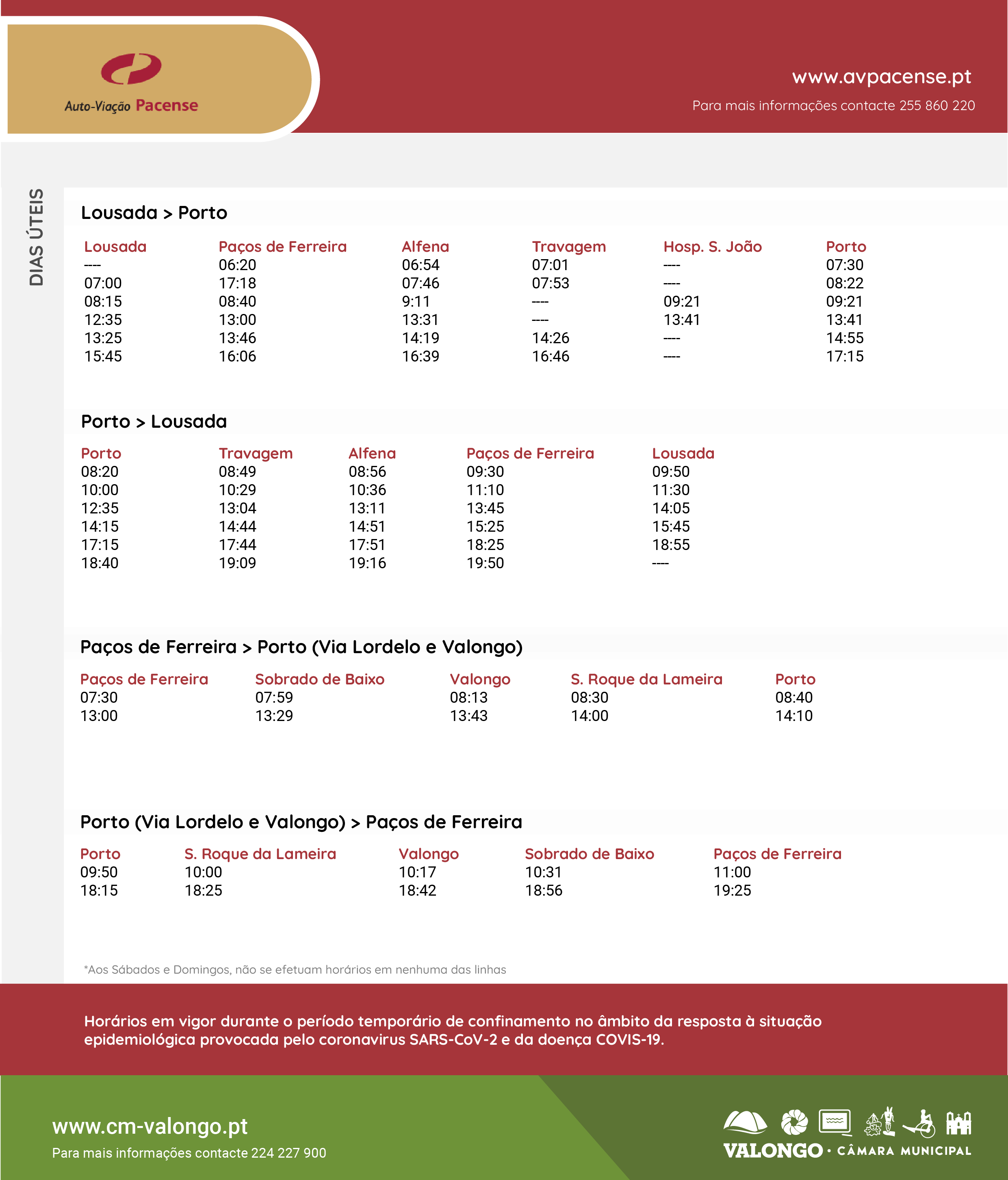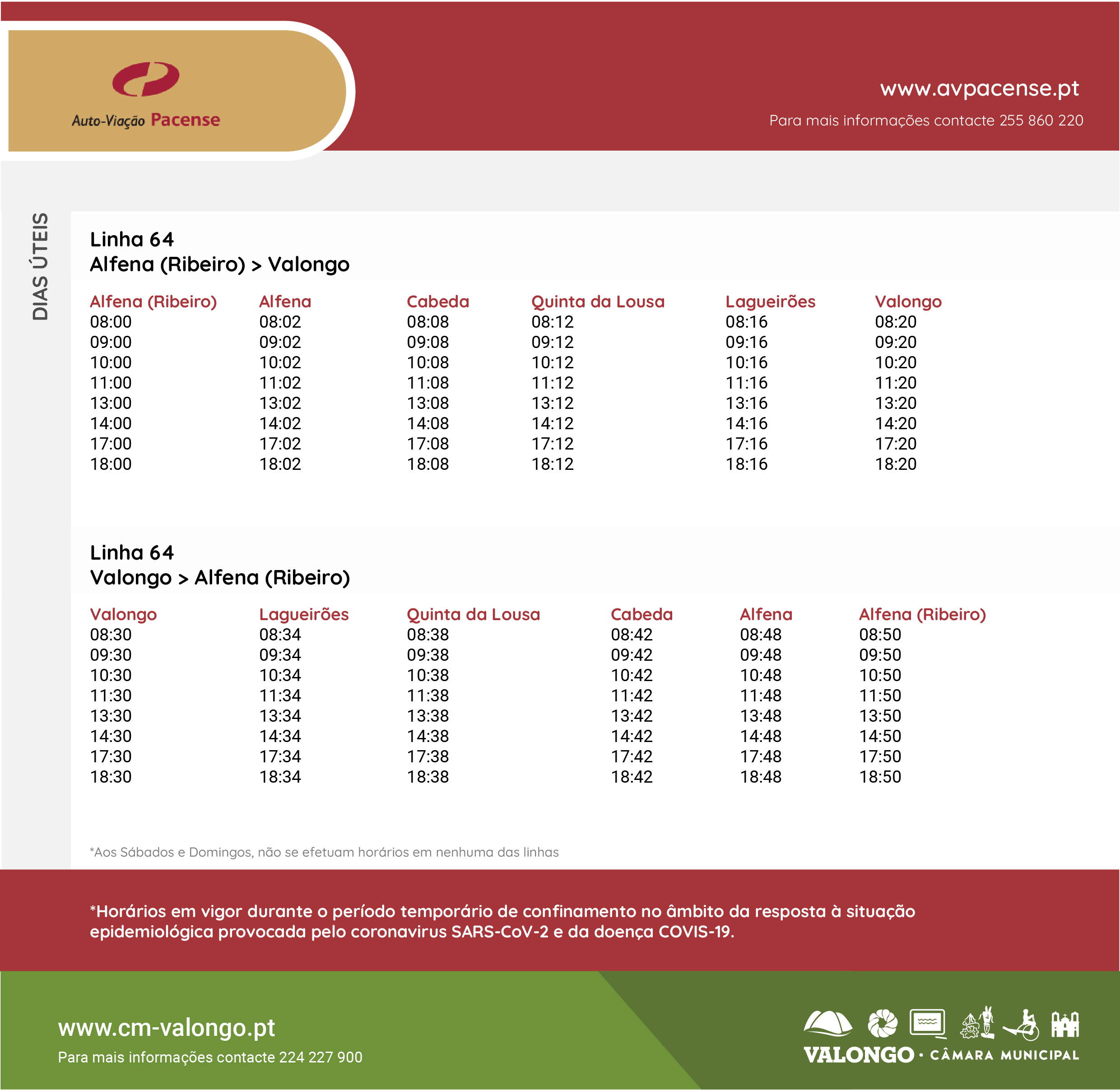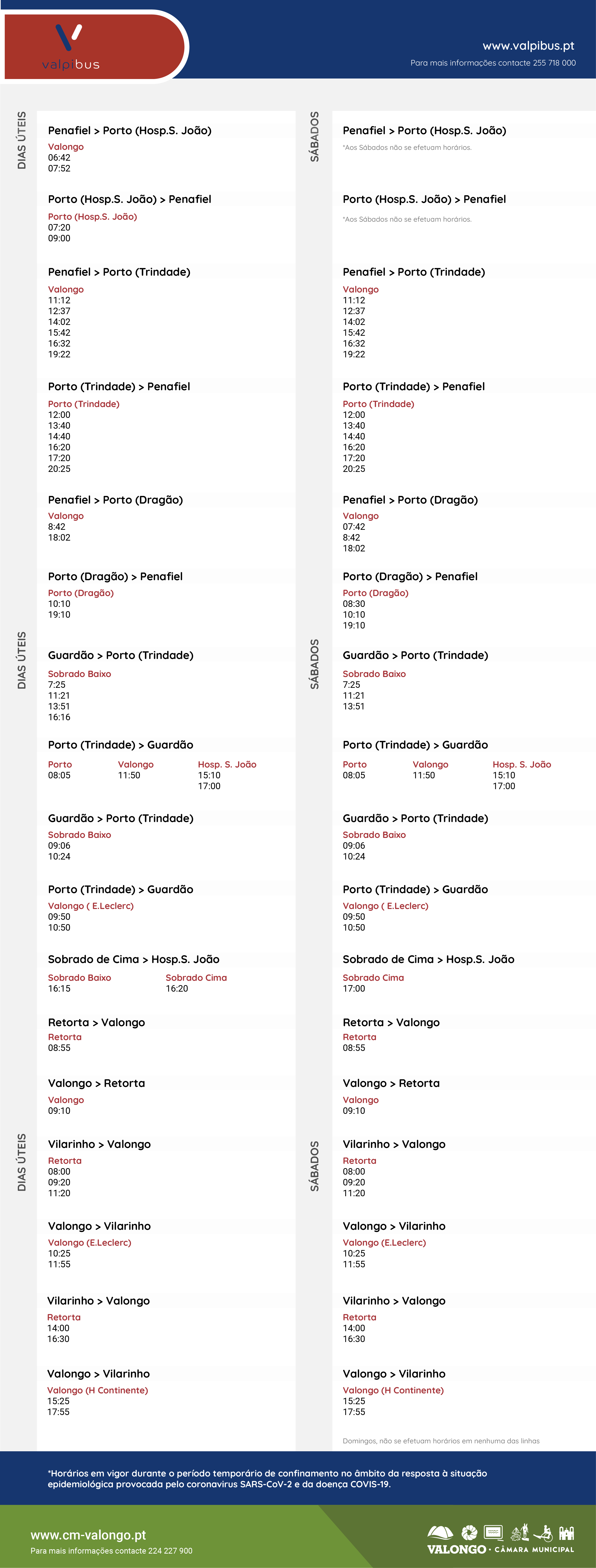 Face às medidas de contingências impostas no âmbito do combate à pandemia Covid-19, os horários dos transportes públicos rodoviários sofreram alterações, que vão vigorar durante o Estado de Emergência. Assim, atualmente os transportes públicos podem continuar a ser utilizados, mas apenas para deslocações essenciais, designadamente para o local de trabalho, para obter cuidados de saúde e aquisição de bens alimentares.