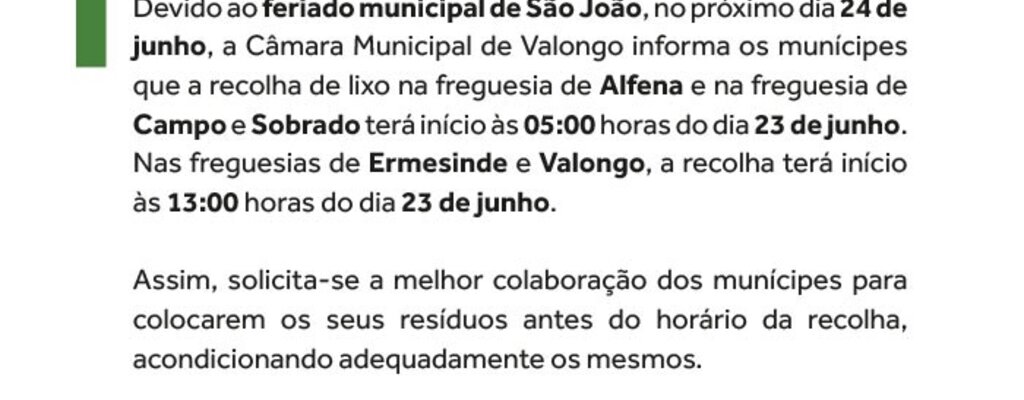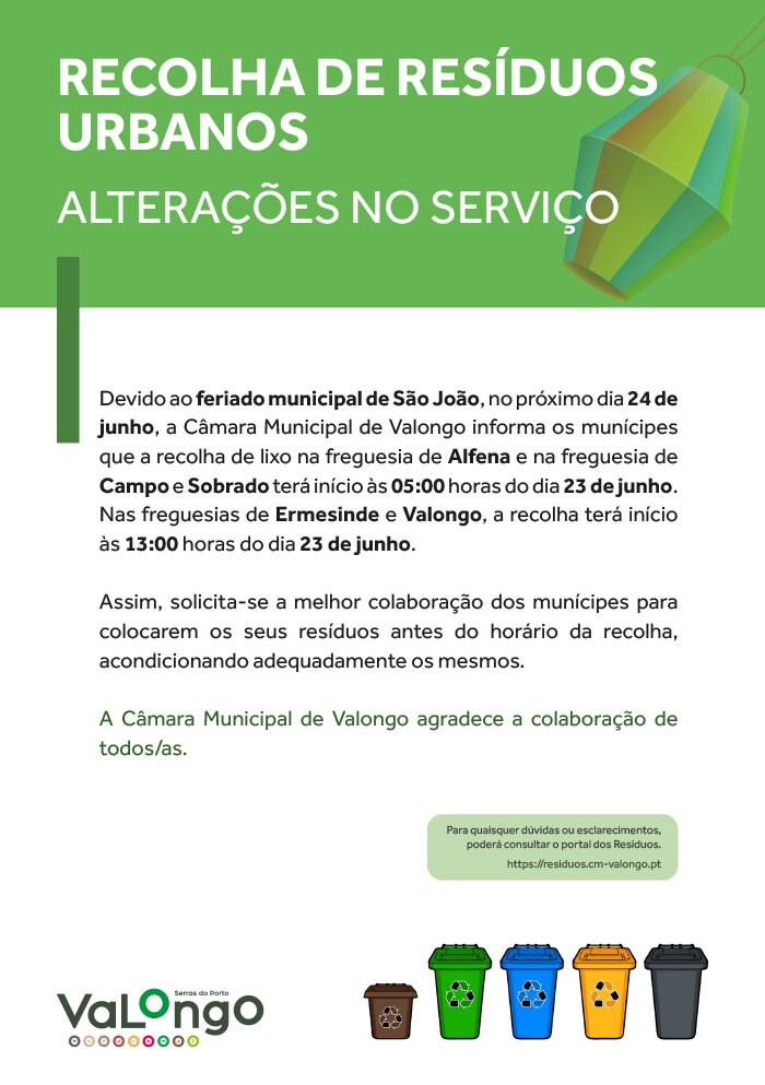Devido ao feriado municipal de São João, no próximo dia 24 de junho, a recolha de lixo na freguesia de Alfena e na freguesia de Campo e Sobrado terá início às 05:00 horas do dia 23 de junho.