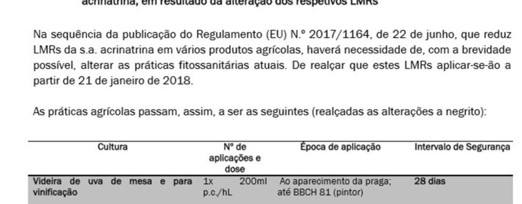 Restrições aos usos de produtos fitofarmacêuticos com base na substância ativa acrinatrina, em resultado da alteração dos respetivos LMRs