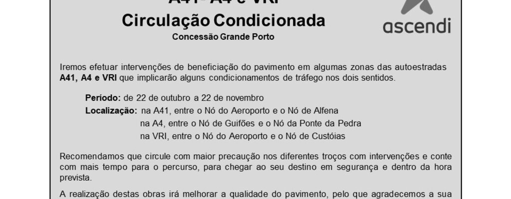 A Ascendi vai efetuar intervenções de beneficiação do pavimento em algumas zonas das autoestradas A41, A4 e VRI que implicarão alguns condicionamentos de tráfego nos dois sentidos.