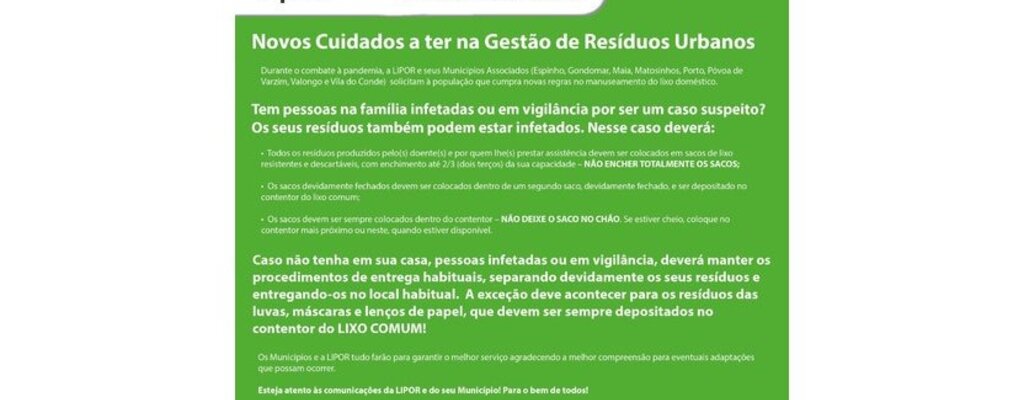 Esteja atento às comunicações da LIPOR e do seu Município! Para o bem de todos!
