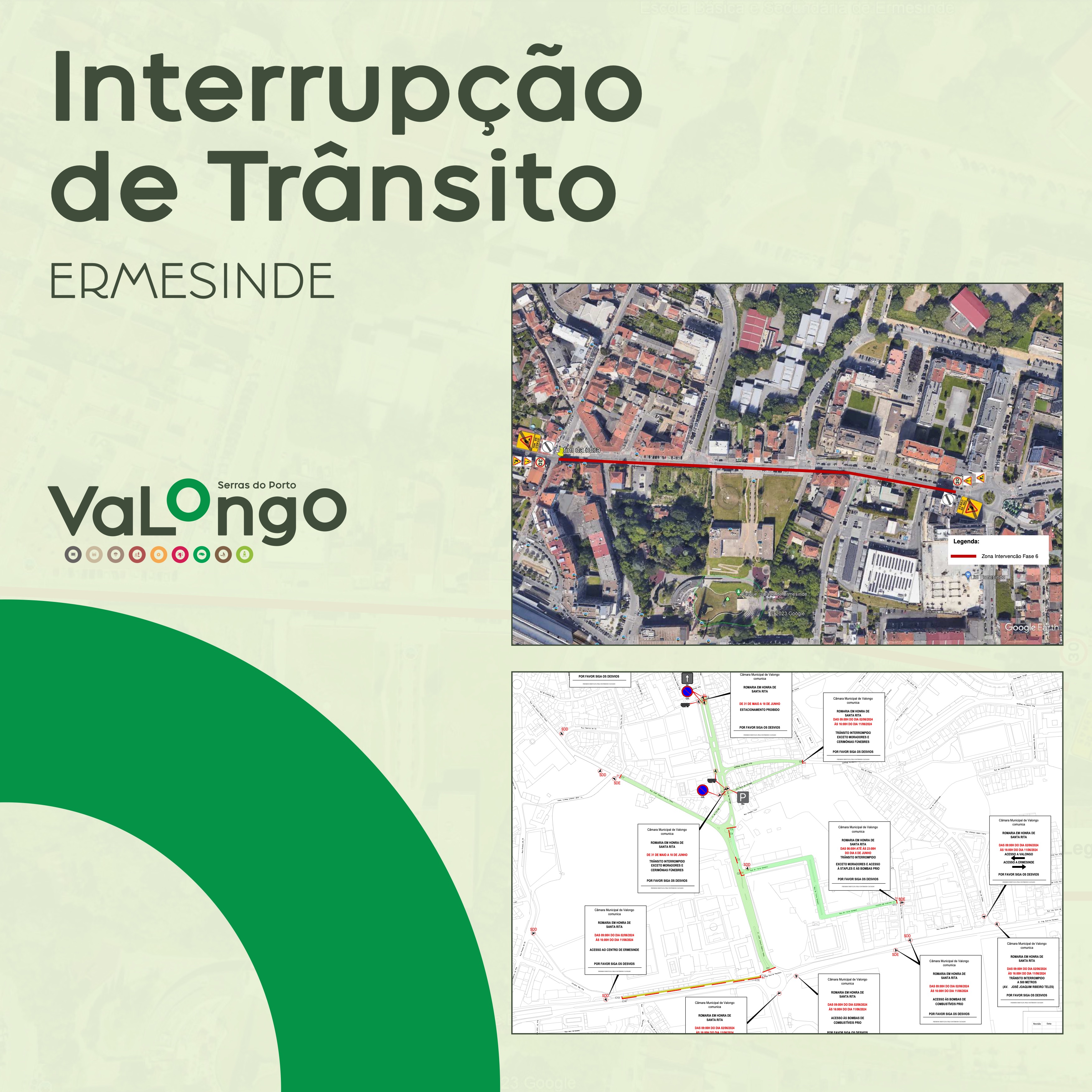 A Câmara Municipal de Valongo informa a população de Ermesinde que, no âmbito das Festas em Honra de Santa Rita e da empreitada denominada “Pavimentações Rua José Joaquim Ribeiro Teles”, ocorrerão condicionamentos de trânsito significativos no centro de Ermesinde, com os principais constrangimentos a ocorrer até 11.06.2024.