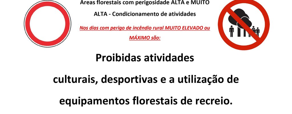 Nos dias com perigo de incêndio rural MUITO ELEVADO ou MÁXIMO são Proibidas atividades culturais, desportivas e a utilização de equipamentos florestais de recreio.