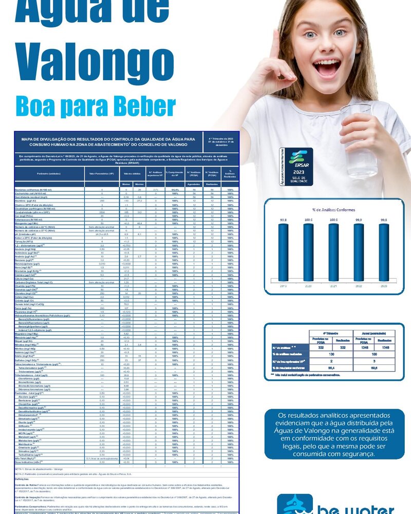 Resultados da qualidade da água da rede pública distribuída pela Águas de Valongo - 4º trimestre de 2023