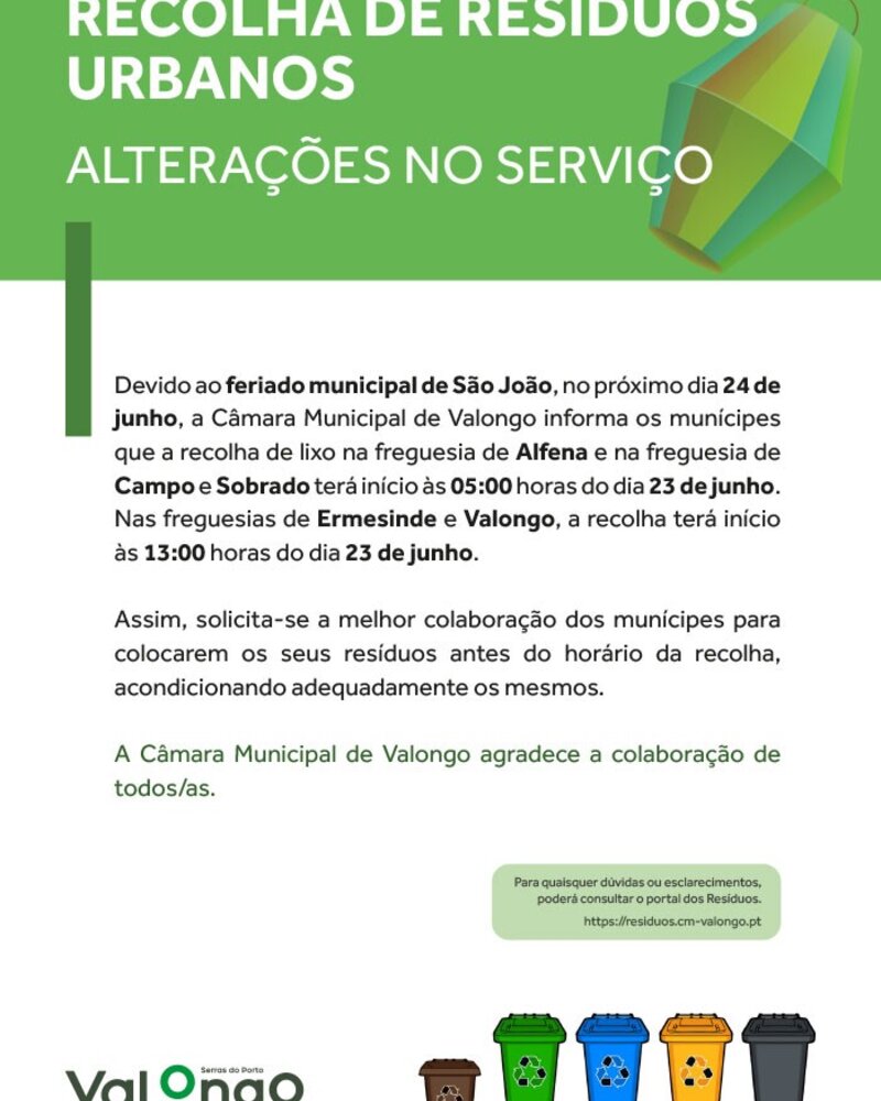 Alteração de recolha de resíduos urbanos no dia 23 de junho