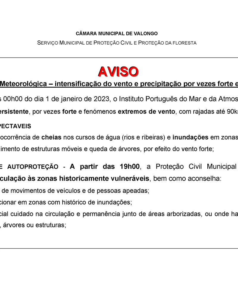 AVISO À POPULAÇÃO: Agravamento das condições meteorológicas