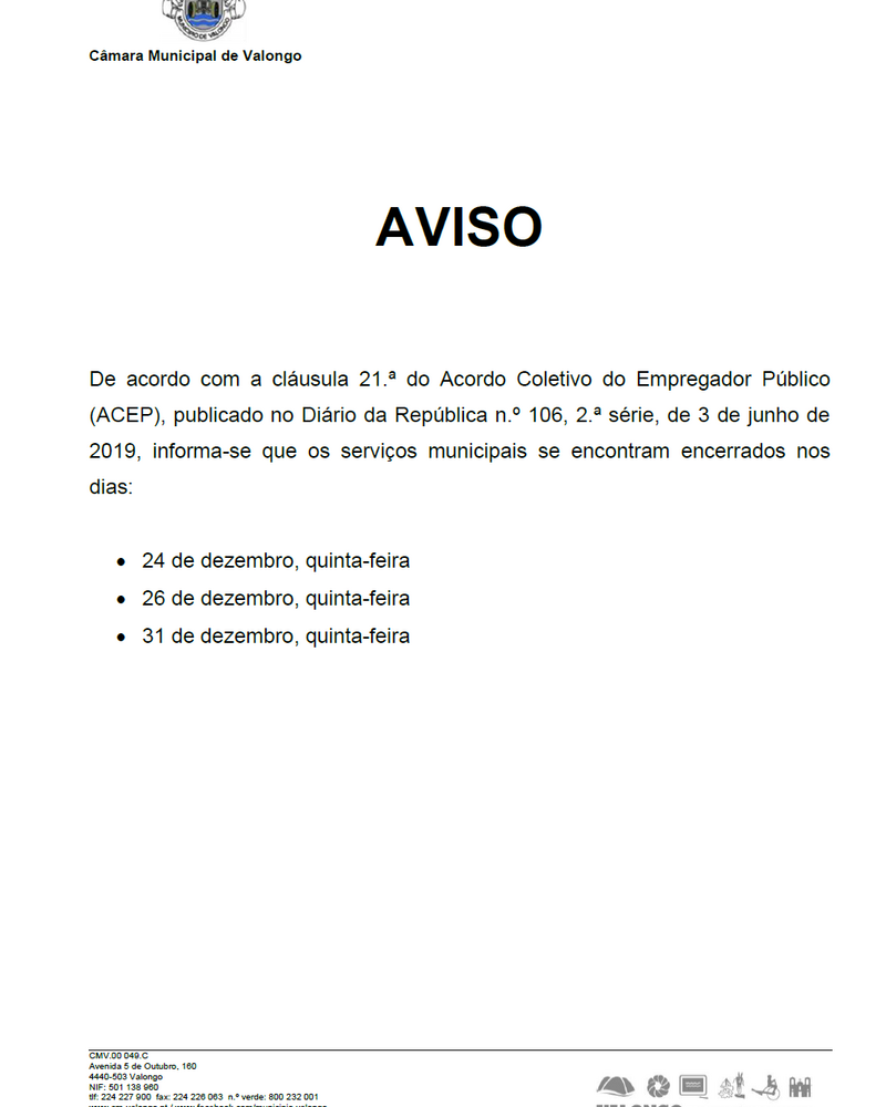 Nesta página encontra alertas e avisos que se relacionam com o Concelho de Valongo, emitidos quer pela Câmara Municipal de Valongo, quer por outras entidades. Informações relativas às Reuniões da Câmara e da Assembleia Municipal, interrupções de trânsito, interrupções no fornecimento de água são alguns dos exemplos que poderá encontrar neste espaço.