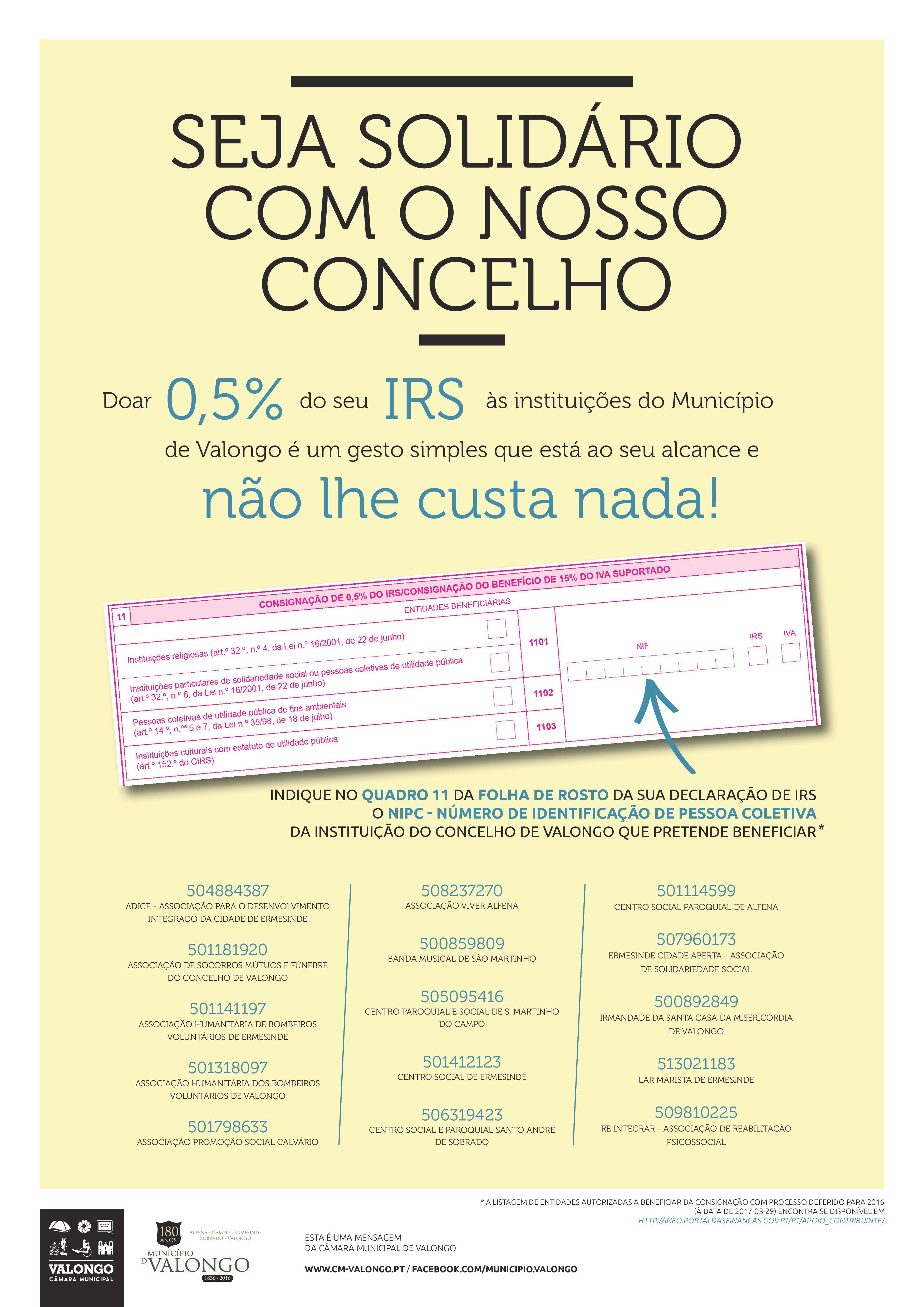 Ajude as instituições do Concelho de Valongo através da doação de 0,5% do seu IRS. É um gesto simples que não acarreta quaisquer custos, pois incide apenas sobre o valor do IRS que efetivamente paga ao Estado, não implicando qualquer diminuição no seu reembolso. Só precisa de indicar na sua declaração de IRS o NIPC - Número de Identificação de Pessoa Coletiva da entidade que pretende beneficiar.