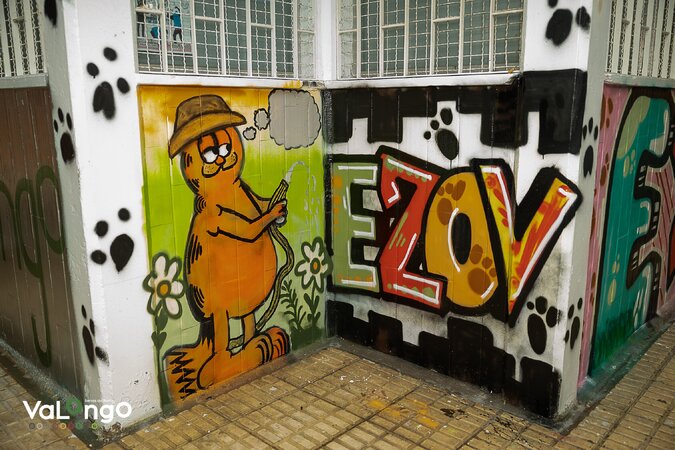 O mural pintado com recurso à técnica do graffiti resulta de um desafio proposto pelo Município para a realização de um trabalho no âmbito das artes visuais que abordasse a importância do cuidar e bem-estar dos animais domésticos.