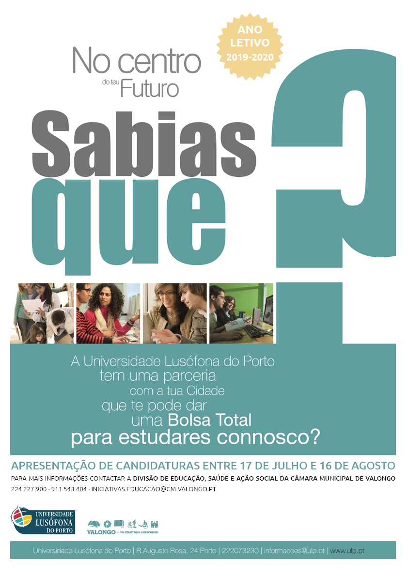 À semelhança do que vem acontecendo, o Município de Valongo irá proceder à receção de candidaturas e seleção de um/a estudante residente no Concelho de Valongo, para beneficiar de uma Bolsa de Estudo a atribuir pela Universidade Lusófona do Porto. O/a estudante deverá ingressar, no ano letivo 2019/2020, pela primeira vez, em cursos de 1.º Ciclo (Licenciaturas) na Universidade Lusófona do Porto, desde que não possua grau académico universitário nem beneficie de outra bolsa de estudo.