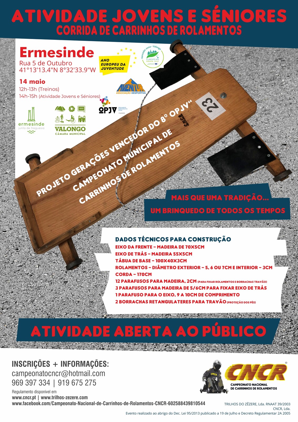 O Município de Valongo em parceria com a Junta Freguesia Ermesinde e a Aventur - Associação Desportiva, vão promover a primeira edição do Campeonato Municipal de Carrinhos de Rolamentos. A prova decorrerá em Ermesinde, no dia 14 de maio, sendo que as inscrições, limitadas às vagas disponíveis - podem ser feitas até dia 12 de maio e são gratuitas.