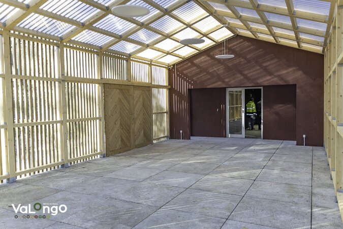Com o objetivo de criar condições ao desenvolvimento de atividades também no exterior foi criada uma área coberta a tardoz, ampliando assim o espaço disponível para as atividades educativas e lúdicas.