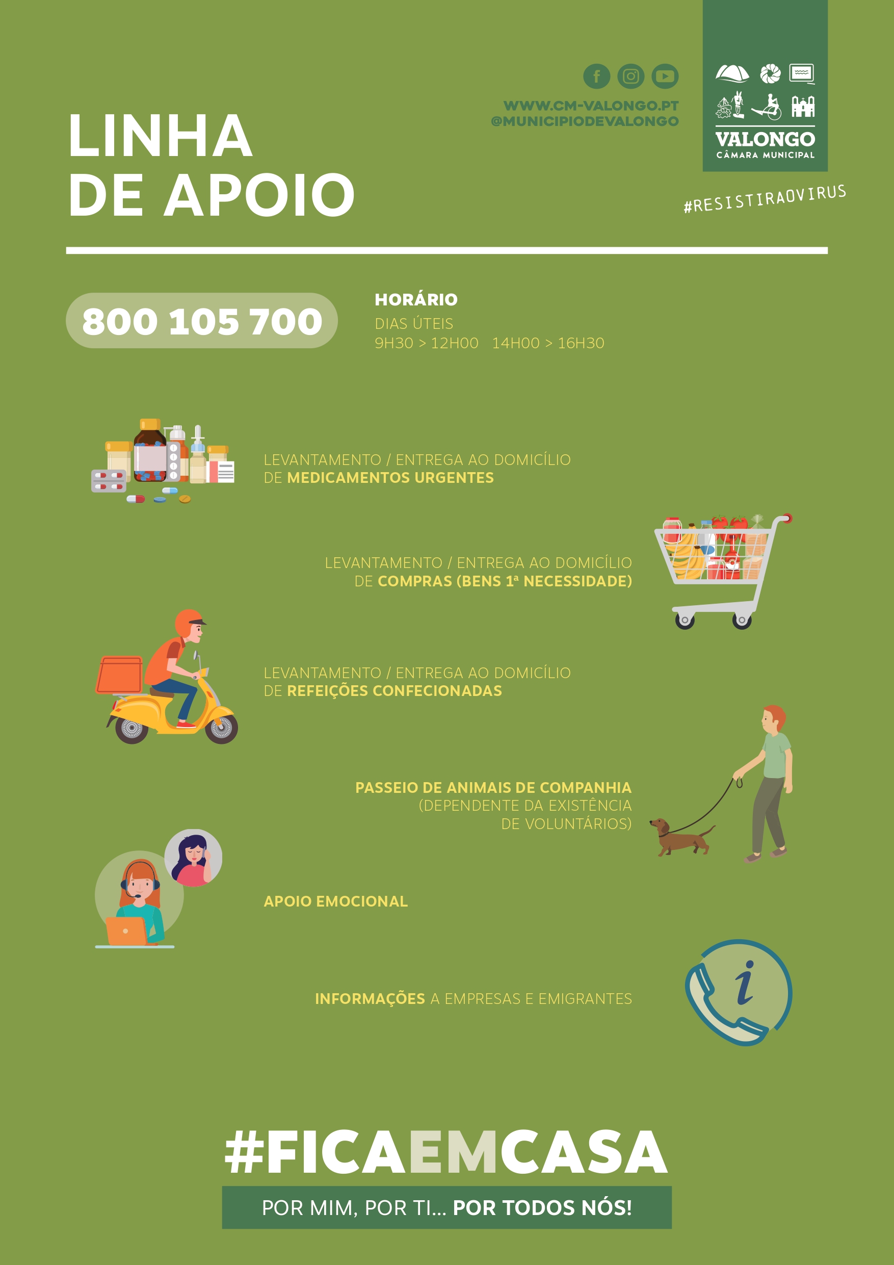 • Apoio social - disponível para grupos de risco, pessoas isoladas e sem retaguarda familiar, que precisam de apoio para compras de géneros alimentícios, medicamentos e outros bens indispensáveis.