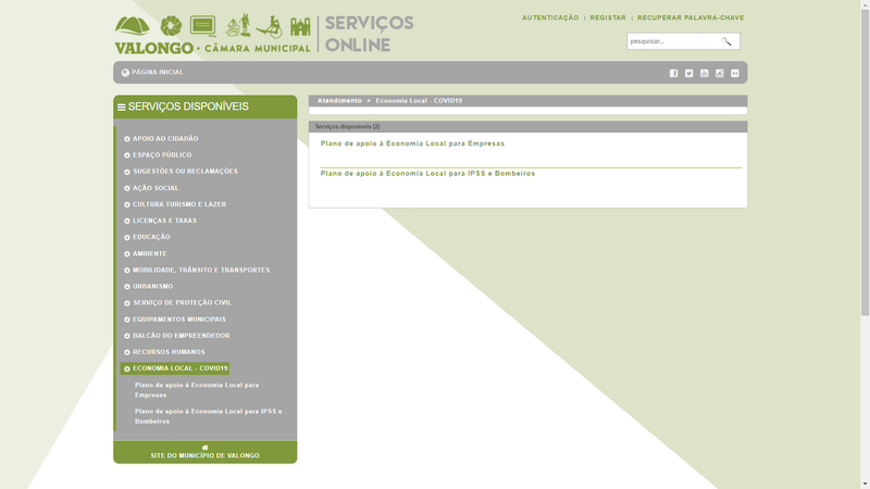 Estão disponíveis na página dos serviços online da Câmara Municipal de Valongo, os requerimentos para as empresas/empresários em nome individual e para as IPSS, Bombeiros e outras associações, que pretendam usufruir das medidas previstas no âmbito do Plano de Apoio à Economia Local - Covid-19.