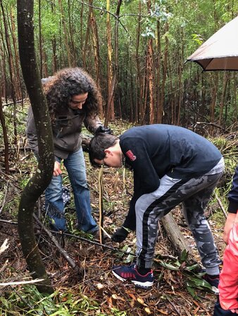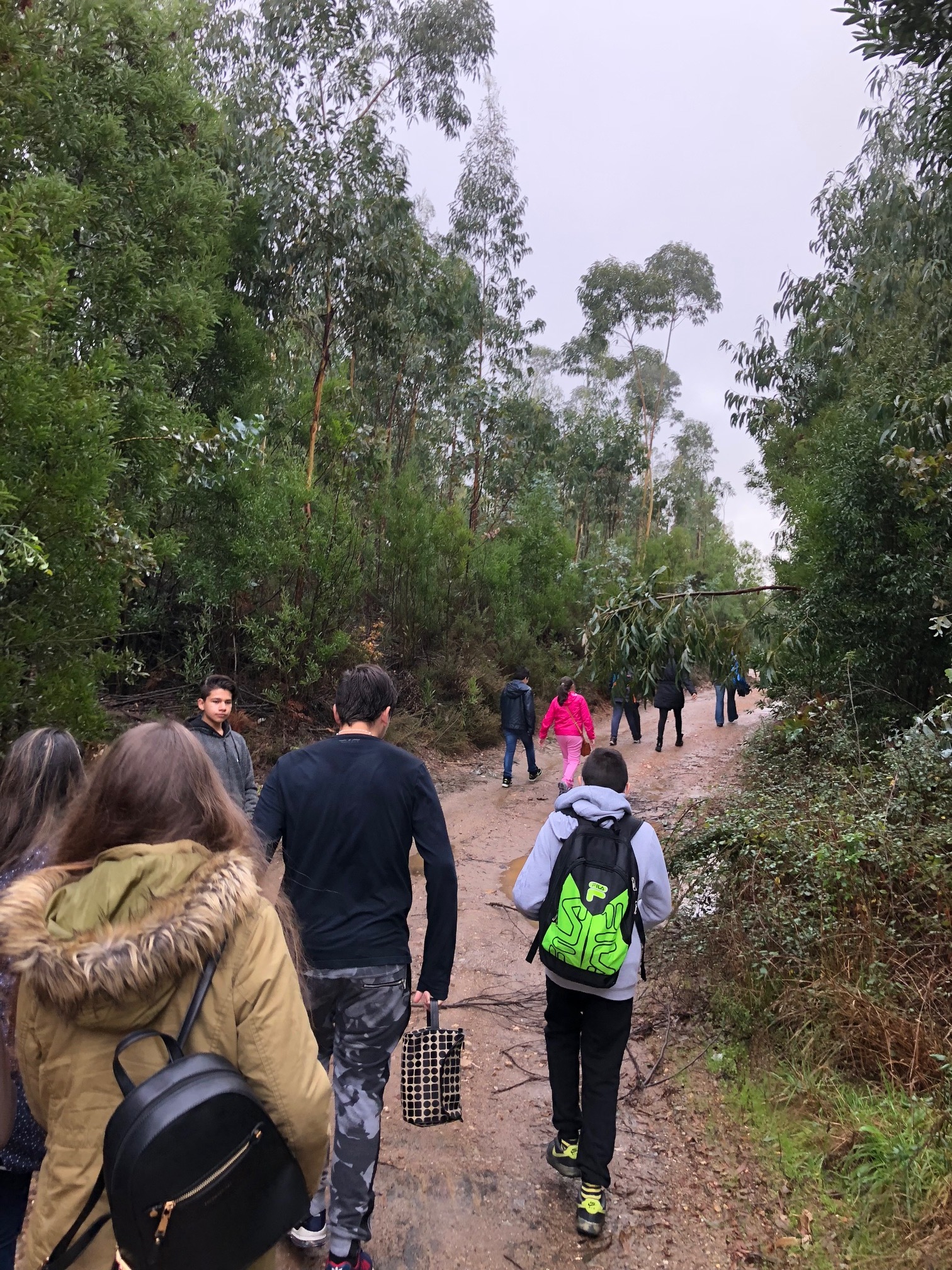 A chuva não ajudou e o descasque de acácias foi apenas demonstrativo, mas os/as estudantes não se deixaram intimidar e no final da ação já identificavam sem qualquer dúvida os tojos, as urzes e a carqueja, assim como o carvalho e o sobreiro, mas também a háquea-picante e a austrália, distinguindo bem o que são espécies nativas e espécies exóticas invasoras.