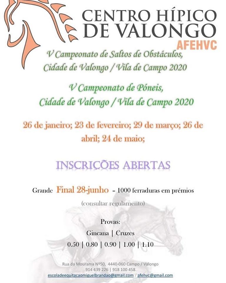 A Academia de Formação Equestre e Hipoterapia de Valongo e Campo, com o apoio do Município de Valongo, irá levar a efeito um conjunto de eventos em 2020, nas suas instalações, como se segue: